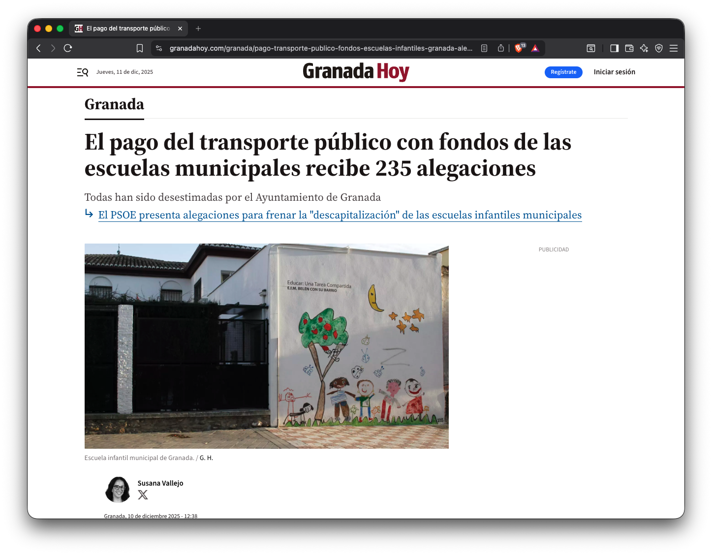 «235 alegaciones de particulares más las del grupo municipal del PSOE y varios patronos de la Fundación Granada Educa. Este es el número de enmiendas que ha recibido el expediente de Economía que aprobaba no dar la aportación municipal a las escuelas municipales en las mensualidades de octubre, noviembre y diciembre para destinar más de 500.000 euros de ese pago al abono de la liquidación del transporte público de 2023, un pago que se realizará con esta y otras modificaciones presupuestarias en un expediente que ya se aprobó inicialmente en el pleno de octubre y que estaba abierto ahora a alegaciones.